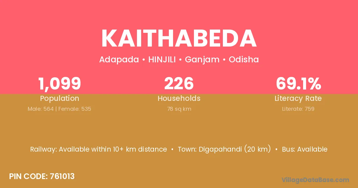 Kaithabeda village has a total population of 1,099 people, of which 564 are males and 535 are females.