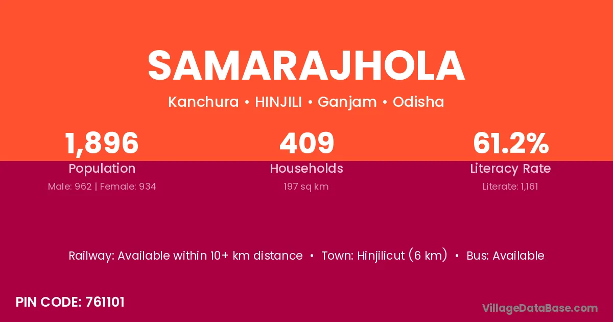Samarajhola village has a total population of 1,896 people, of which 962 are males and 934 are females.