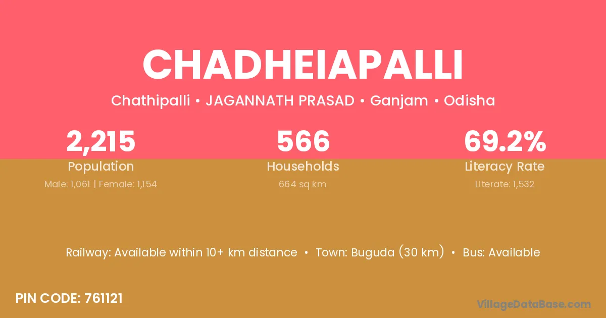 Buguda (30 km) is the nearest town to Chadheiapalli village for major economic activities and is located approximately 30 km away.