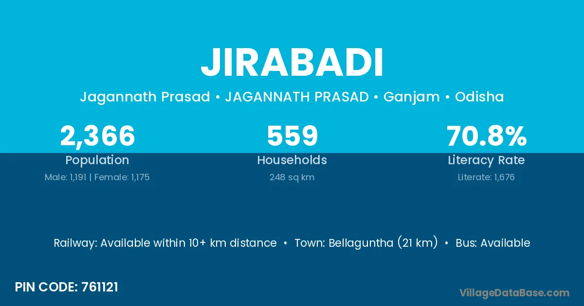 Bellaguntha (21 km) is the nearest town to Jirabadi village for major economic activities and is located approximately 21 km away.
