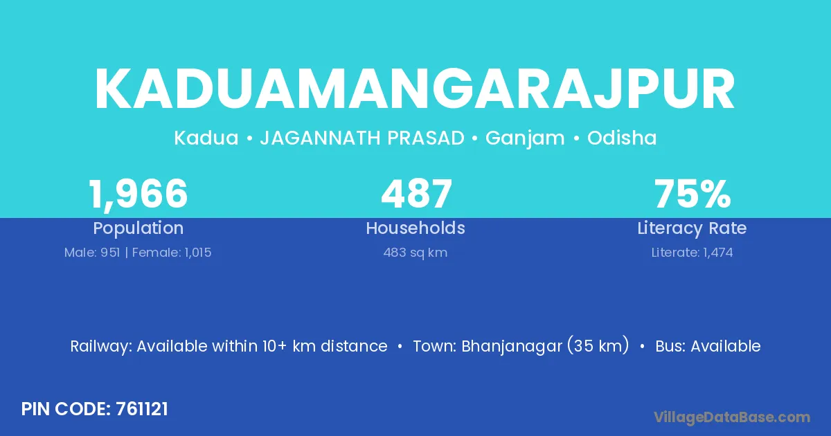 Bhanjanagar (35 km) is the nearest town to Kaduamangarajpur village for major economic activities and is located approximately 35 km away.