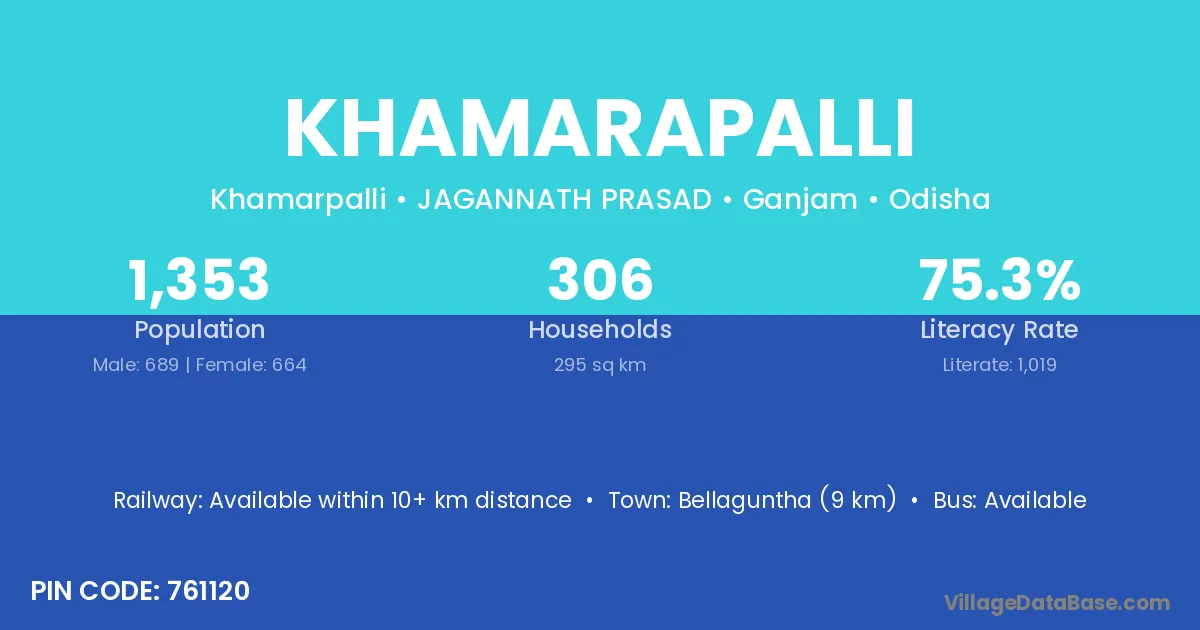 Khamarapalli village has a total population of 1,353 people, of which 689 are males and 664 are females.