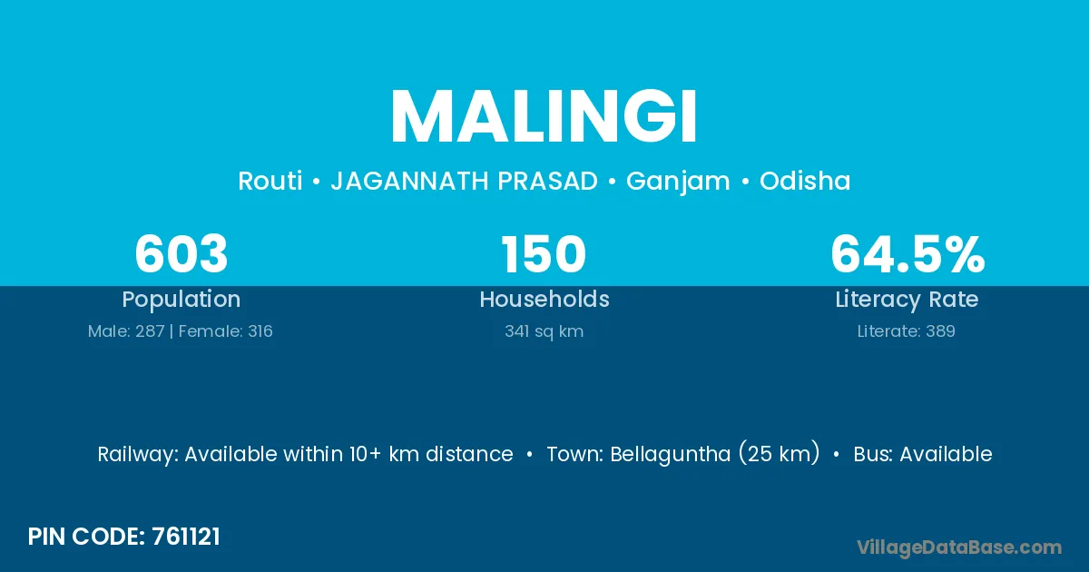 Malingi village has a total population of 603 people, of which 287 are males and 316 are females.