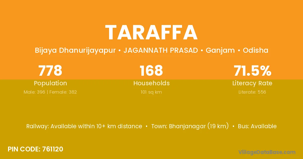 Bhanjanagar (19 km) is the nearest town to Taraffa village for major economic activities and is located approximately 19 km away.