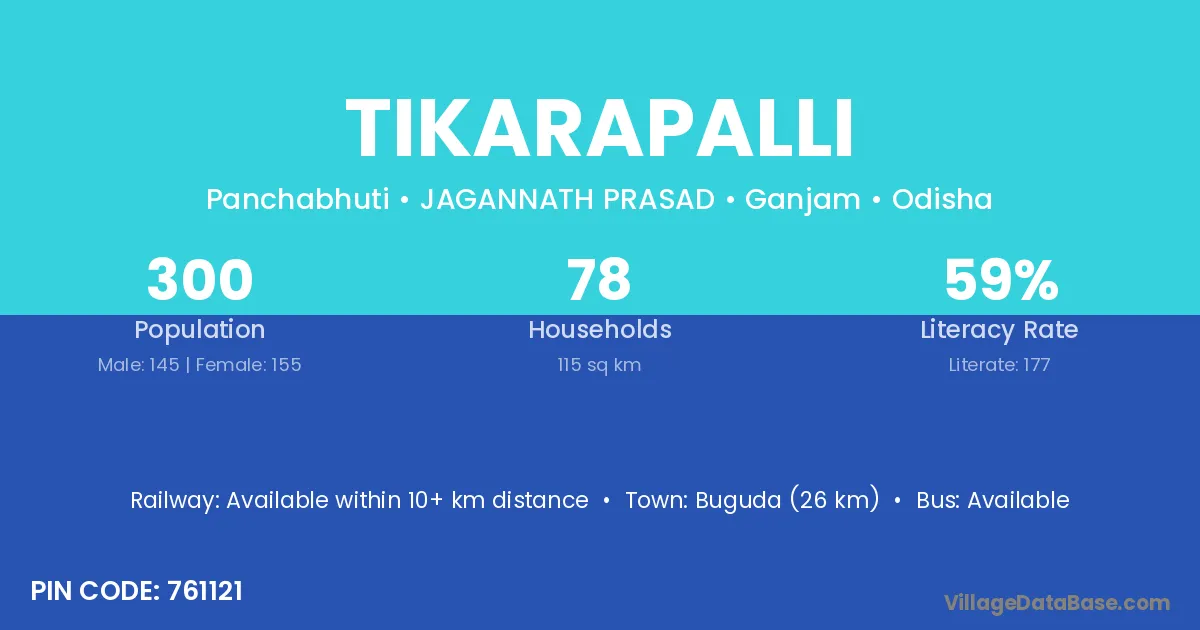 Buguda (26 km) is the nearest town to Tikarapalli village for major economic activities and is located approximately 26 km away.