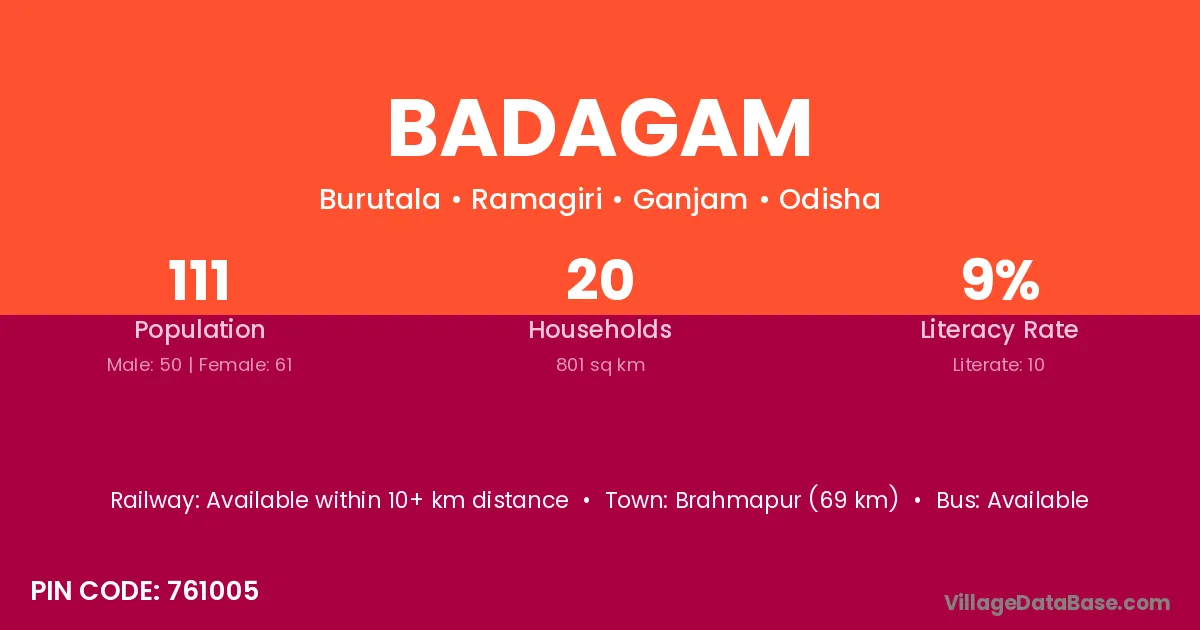 Brahmapur (69 km) is the nearest town to Badagam village for major economic activities and is located approximately 69 km away.