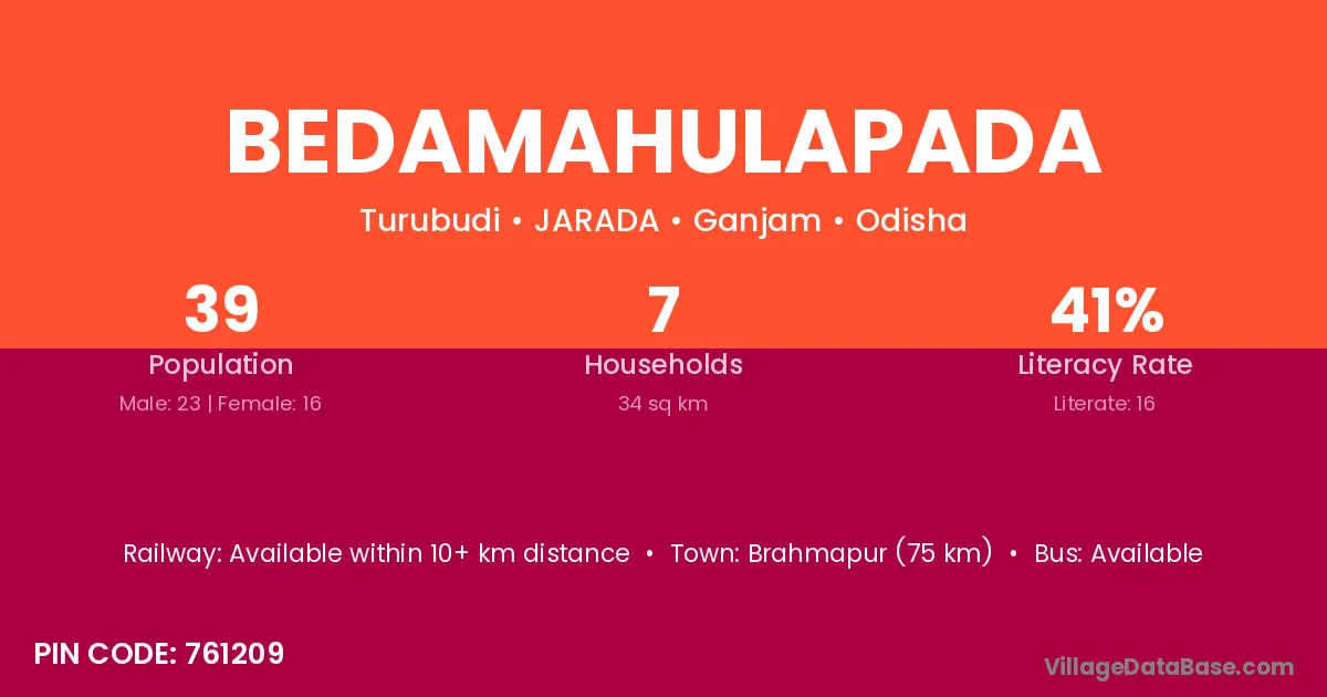 Bedamahulapada village has a total population of 39 people, of which 23 are males and 16 are females.
