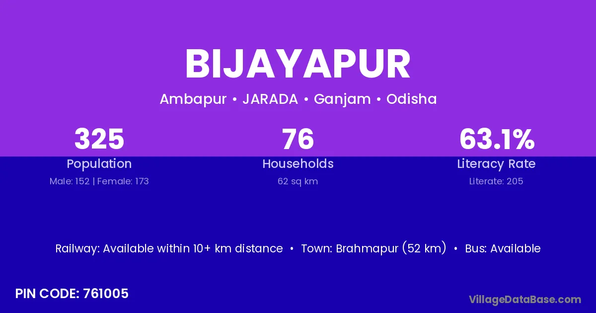 Brahmapur (52 km) is the nearest town to Bijayapur village for major economic activities and is located approximately 52 km away.
