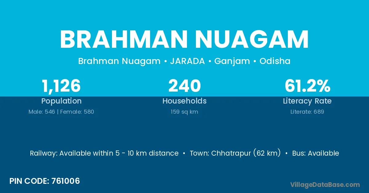 Chhatrapur (62 km) is the nearest town to Brahman Nuagam village for major economic activities and is located approximately 62 km away.