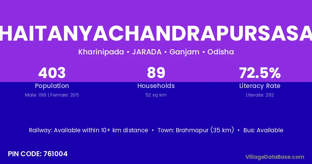 Brahmapur (35 km) is the nearest town to Chaitanyachandrapursasan village for major economic activities and is located approximately 35 km away.