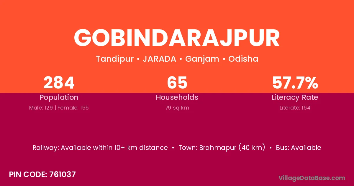 Brahmapur (40 km) is the nearest town to Gobindarajpur village for major economic activities and is located approximately 40 km away.