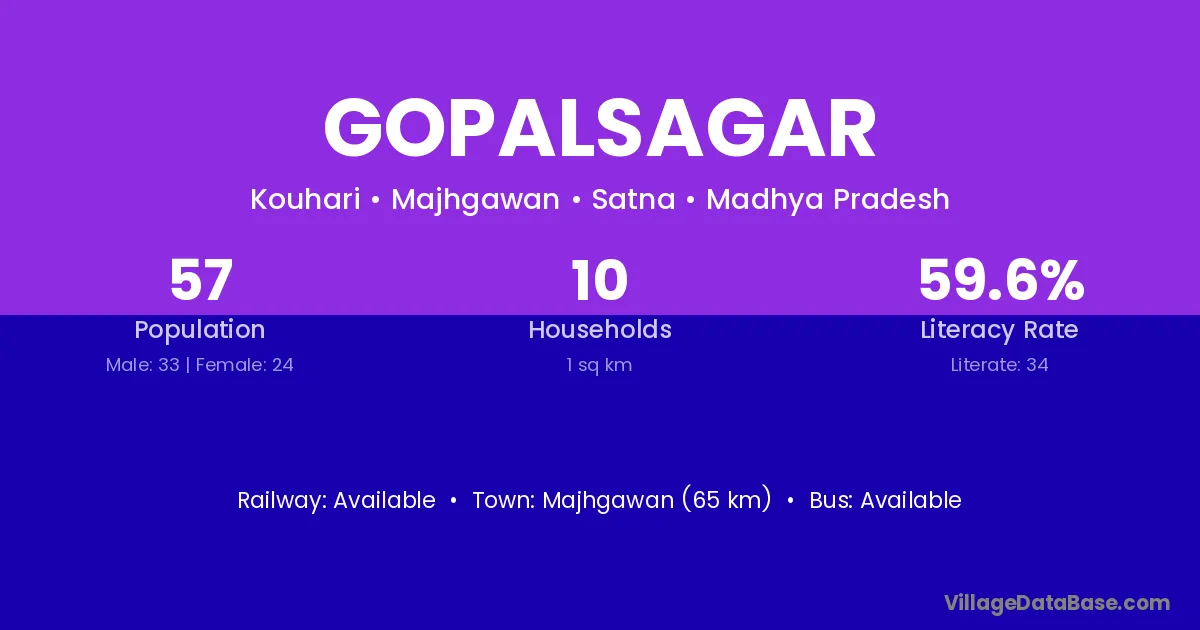 The literacy rate of Gopalsagar village is 37.65%. Male literacy stands at 45.49% and female literacy at 30.23%.