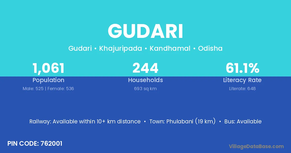 Brahmapur (61 km) is the nearest town to Gudari village for major economic activities and is located approximately 61 km away.