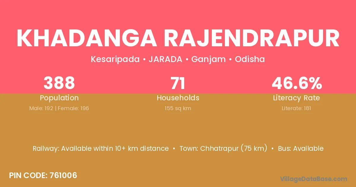 Chhatrapur (75 km) is the nearest town to Khadanga Rajendrapur village for major economic activities and is located approximately 75 km away.