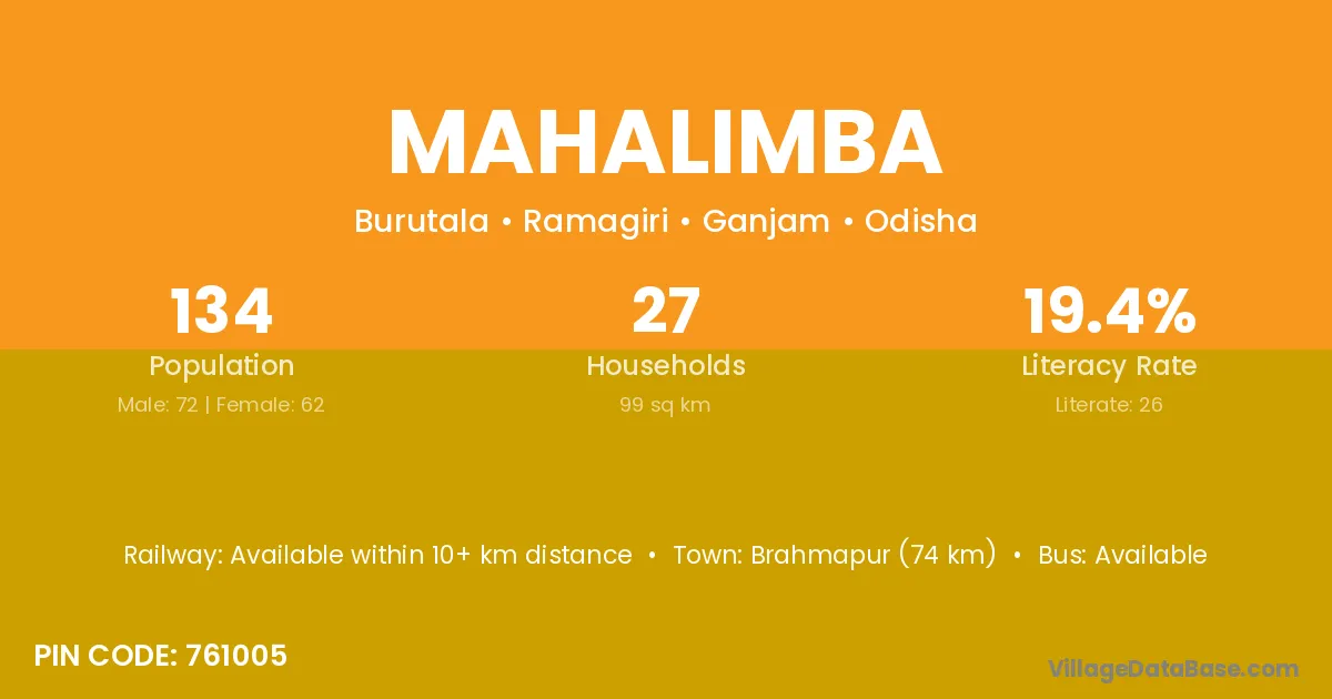 Brahmapur (75 km) is the nearest town to Mahalimba village for major economic activities and is located approximately 75 km away.