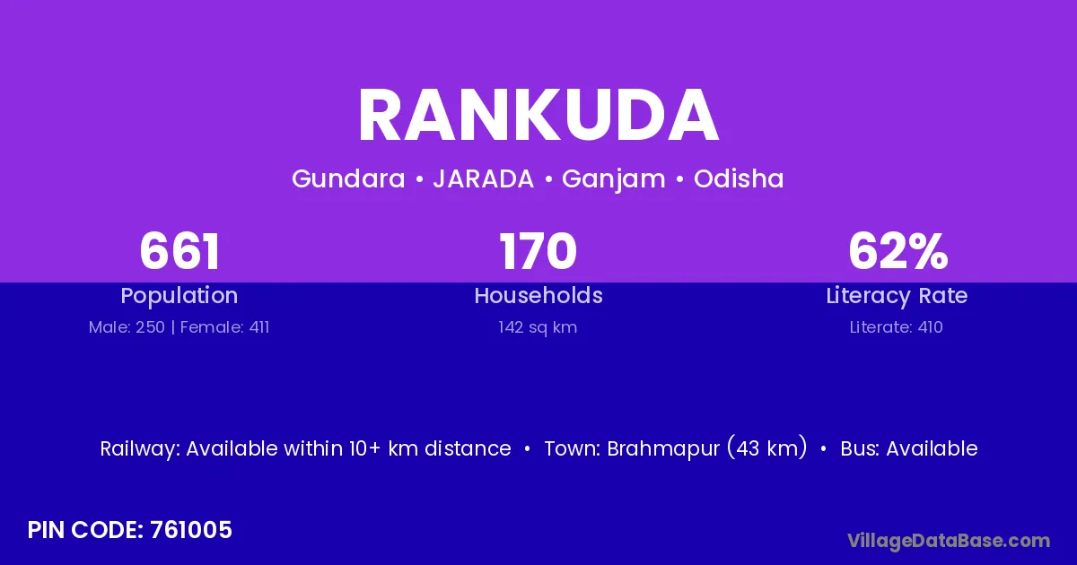 Brahmapur (43 km) is the nearest town to Rankuda village for major economic activities and is located approximately 43 km away.