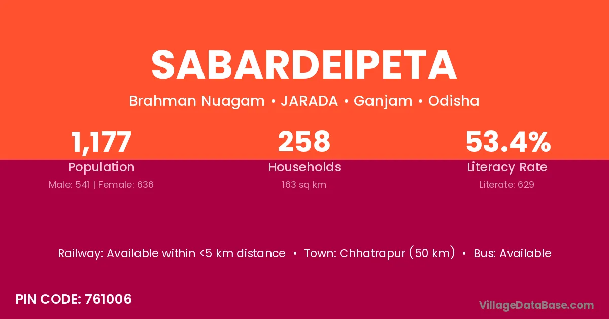 Sabardeipeta village has a total population of 1,177 people, of which 541 are males and 636 are females.