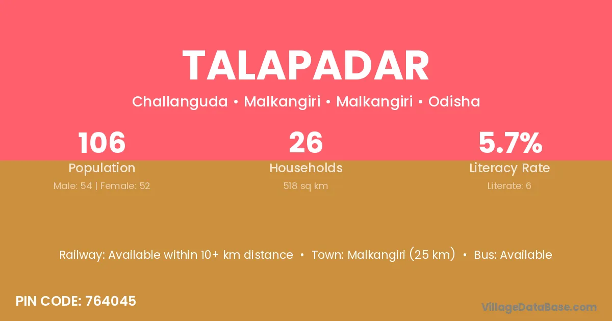 The literacy rate of Talapadar village is 27.08%. Male literacy stands at 37.50% and female literacy at 16.67%.