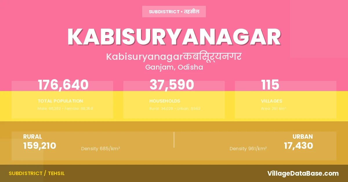 According to the 2011 census The total area of KABISURYANAGAR Tehsil is 251 km², with a population of 176640 people. The population density is 705 inhabitants per square kilometre, and there are approximately 37590 houses in the sub district.