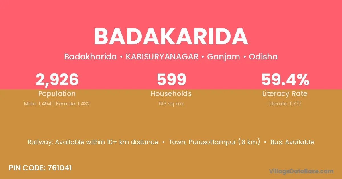Purusottampur (6 km) is the nearest town to Badakarida village for major economic activities and is located approximately 6 km away.