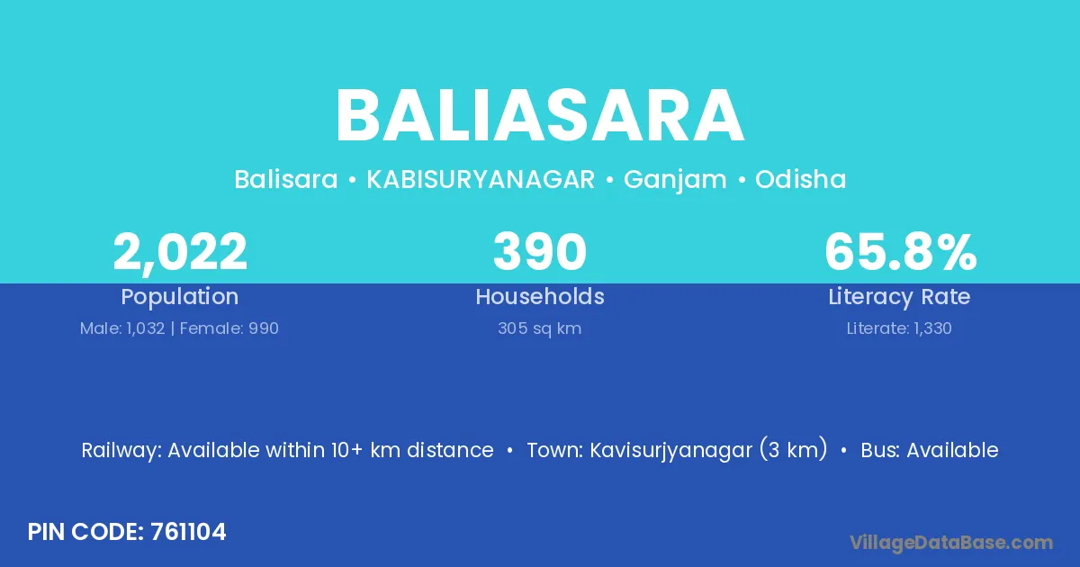 Kavisurjyanagar (3 km) is the nearest town to Baliasara village for major economic activities and is located approximately 3 km away.
