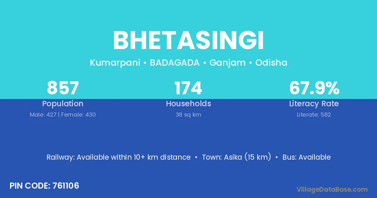 Kavisurjyanagar (10 km) is the nearest town to Bhetasingi village for major economic activities and is located approximately 10 km away.
