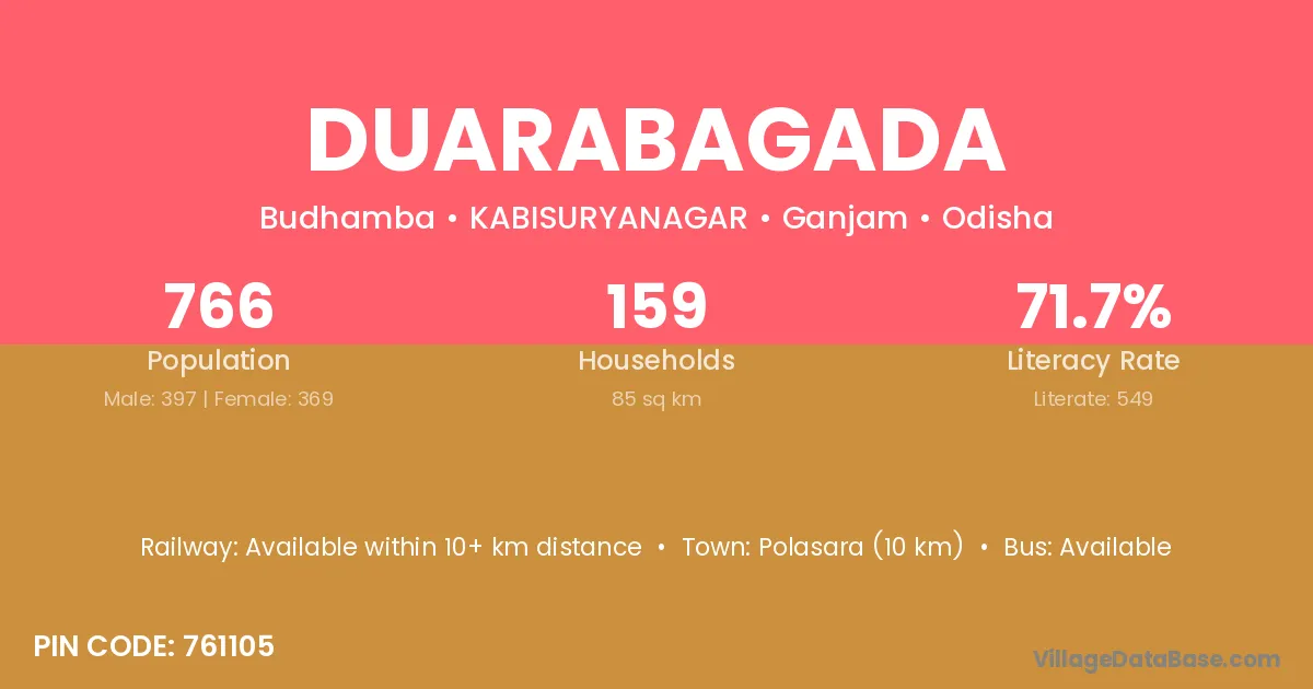 Polasara (10 km) is the nearest town to Duarabagada village for major economic activities and is located approximately 10 km away.
