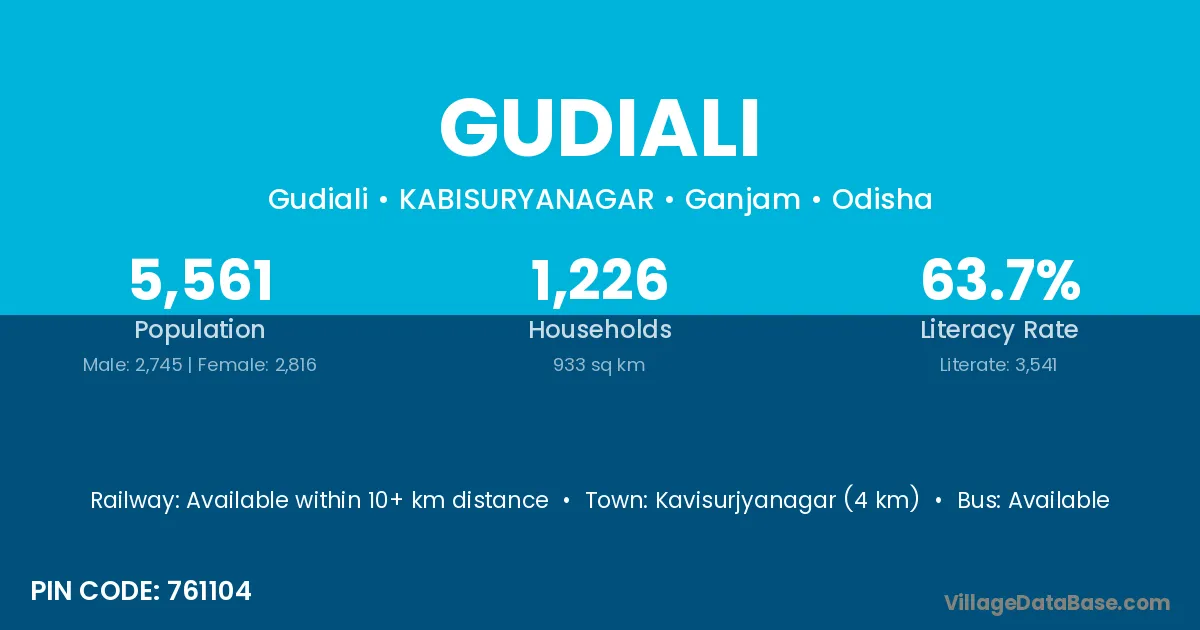 Kavisurjyanagar (4 km) is the nearest town to Gudiali village for major economic activities and is located approximately 4 km away.