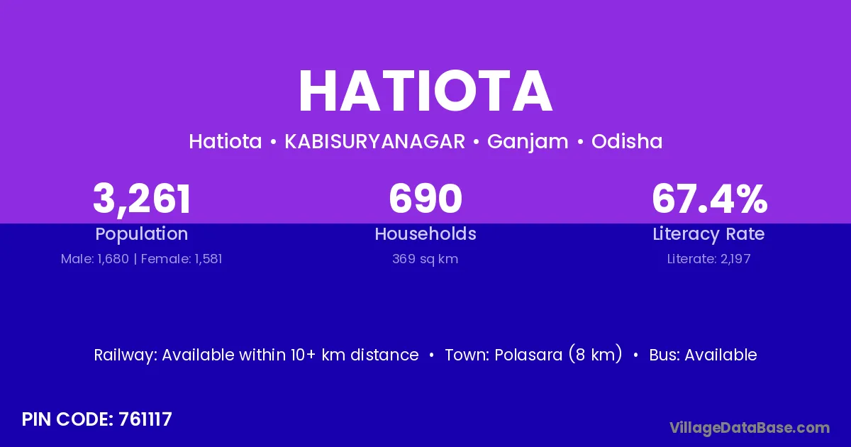 Polasara (8 km) is the nearest town to Hatiota village for major economic activities and is located approximately 8 km away.