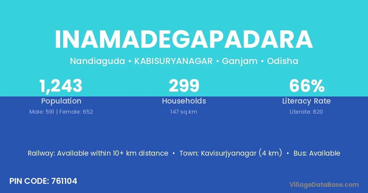 Inamadegapadara village has a total population of 1,243 people, of which 591 are males and 652 are females.