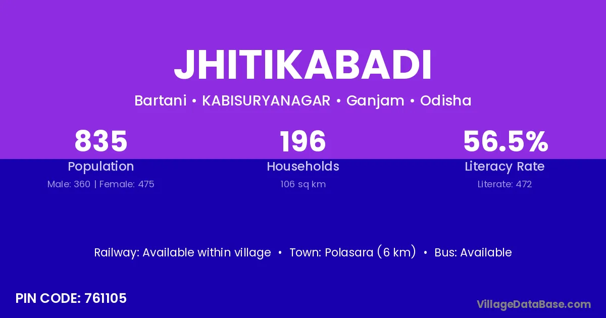 Polasara (6 km) is the nearest town to Jhitikabadi village for major economic activities and is located approximately 6 km away.