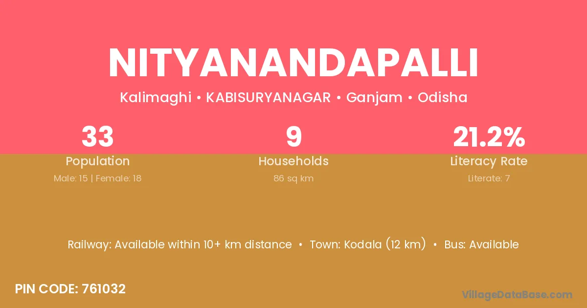 Kodala (12 km) is the nearest town to Nityanandapalli village for major economic activities and is located approximately 12 km away.