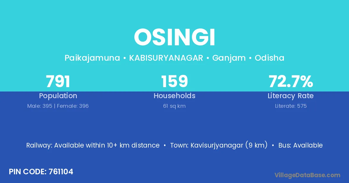 Kavisurjyanagar (9 km) is the nearest town to Osingi village for major economic activities and is located approximately 9 km away.
