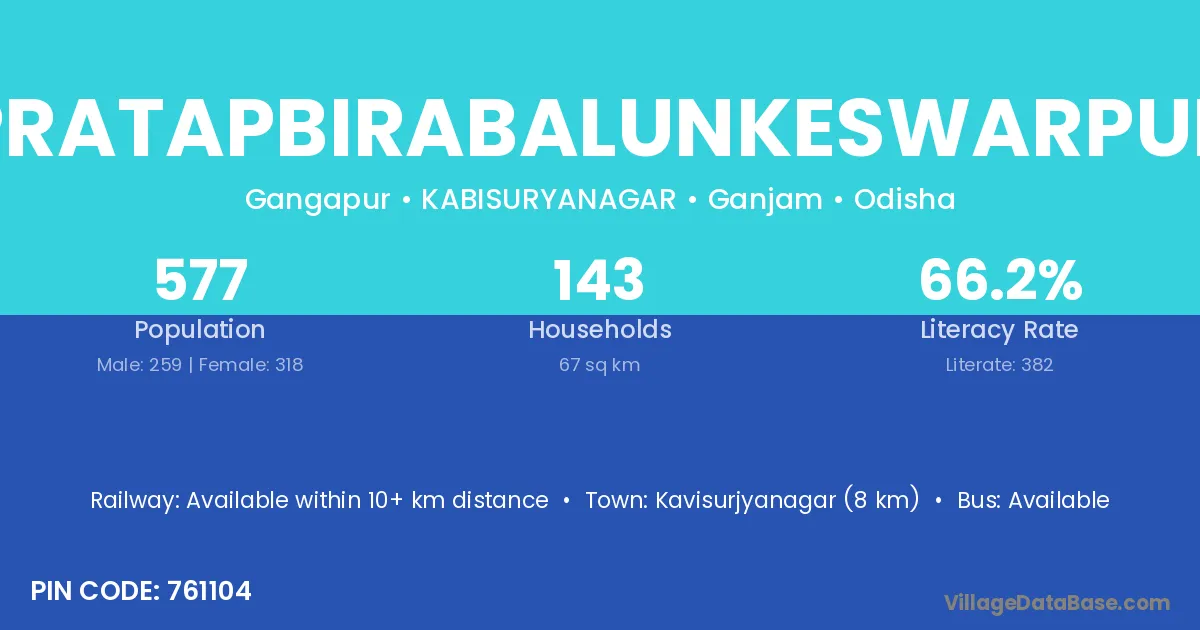 Pratapbirabalunkeswarpur village has a total population of 577 people, of which 259 are males and 318 are females.