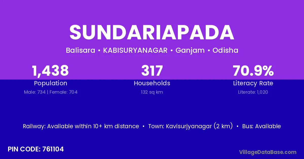 Kavisurjyanagar (2 km) is the nearest town to Sundariapada village for major economic activities and is located approximately 2 km away.