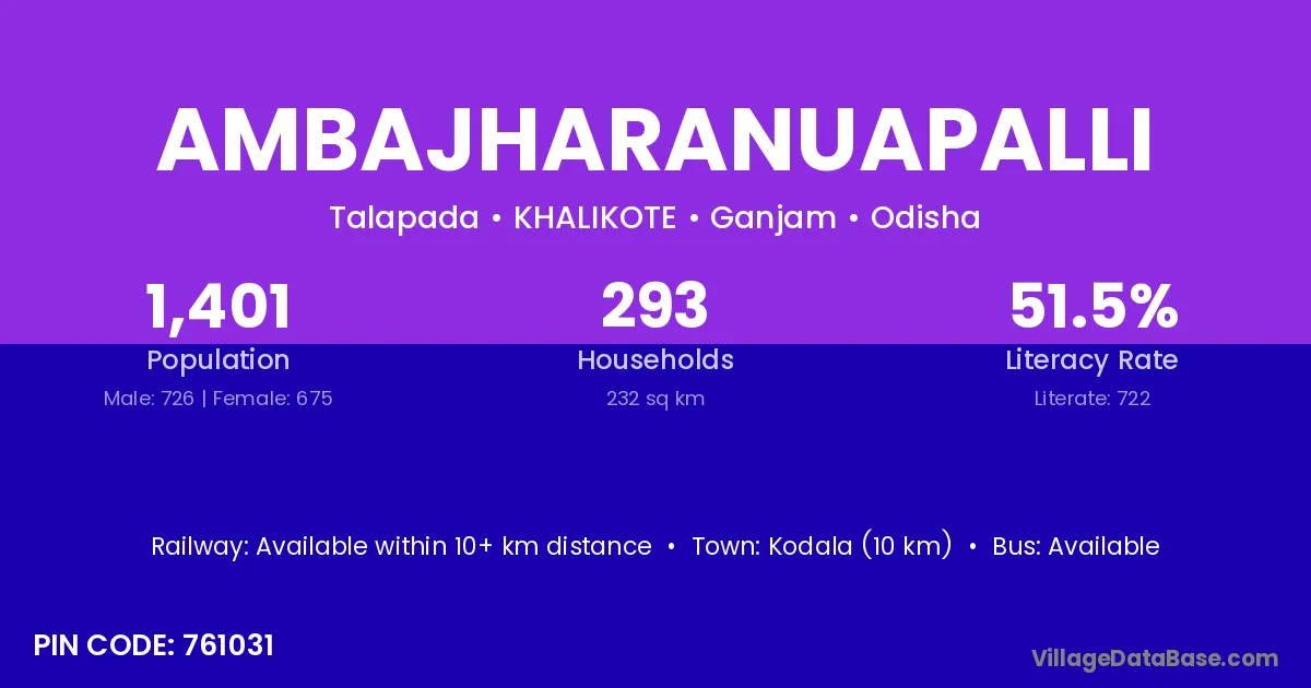 Kodala (10 km) is the nearest town to Ambajharanuapalli village for major economic activities and is located approximately 10 km away.