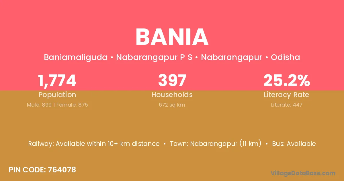 Khalikote (1 km) is the nearest town to Bania village for major economic activities and is located approximately 1 km away.