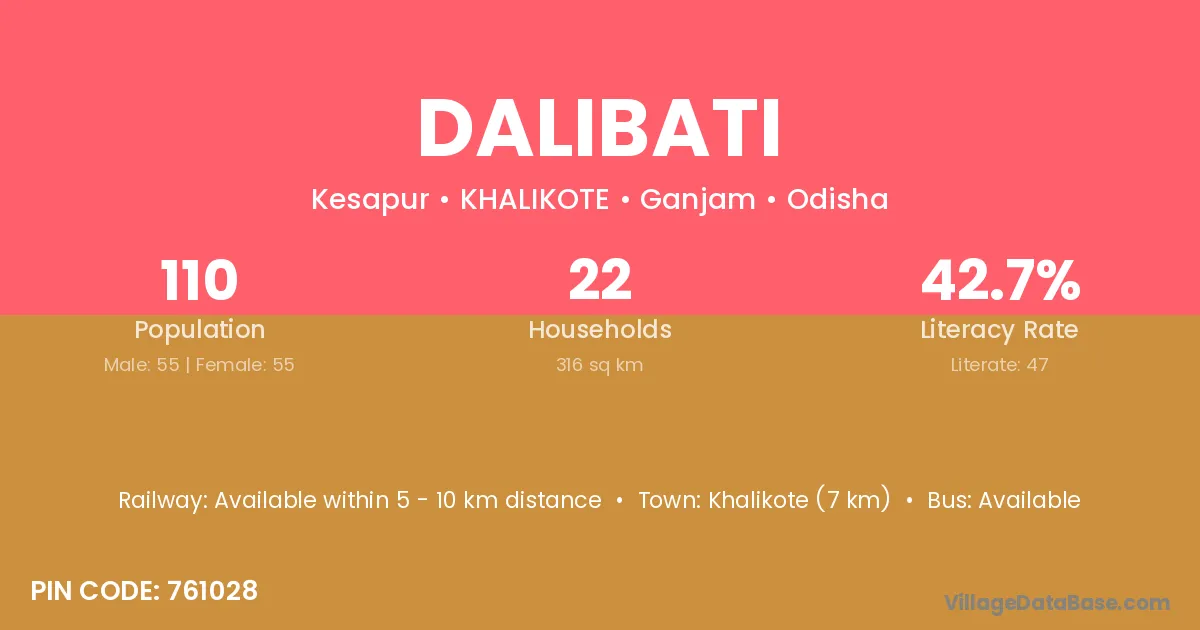Dalibati village has a total population of 110 people, of which 55 are males and 55 are females.