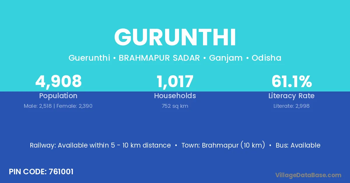 Khalikote (15 km) is the nearest town to Gurunthi village for major economic activities and is located approximately 15 km away.