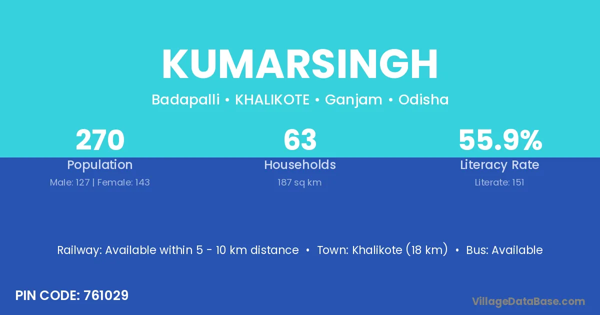 Khalikote (18 km) is the nearest town to Kumarsingh village for major economic activities and is located approximately 18 km away.