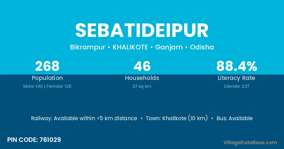 Khalikote (10 km) is the nearest town to Sebatideipur village for major economic activities and is located approximately 10 km away.