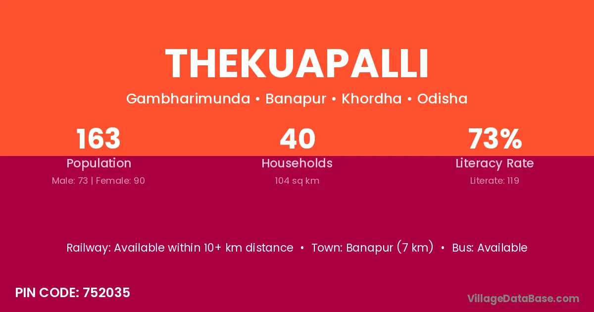 Khalikote (9 km) is the nearest town to Thekuapalli village for major economic activities and is located approximately 9 km away.