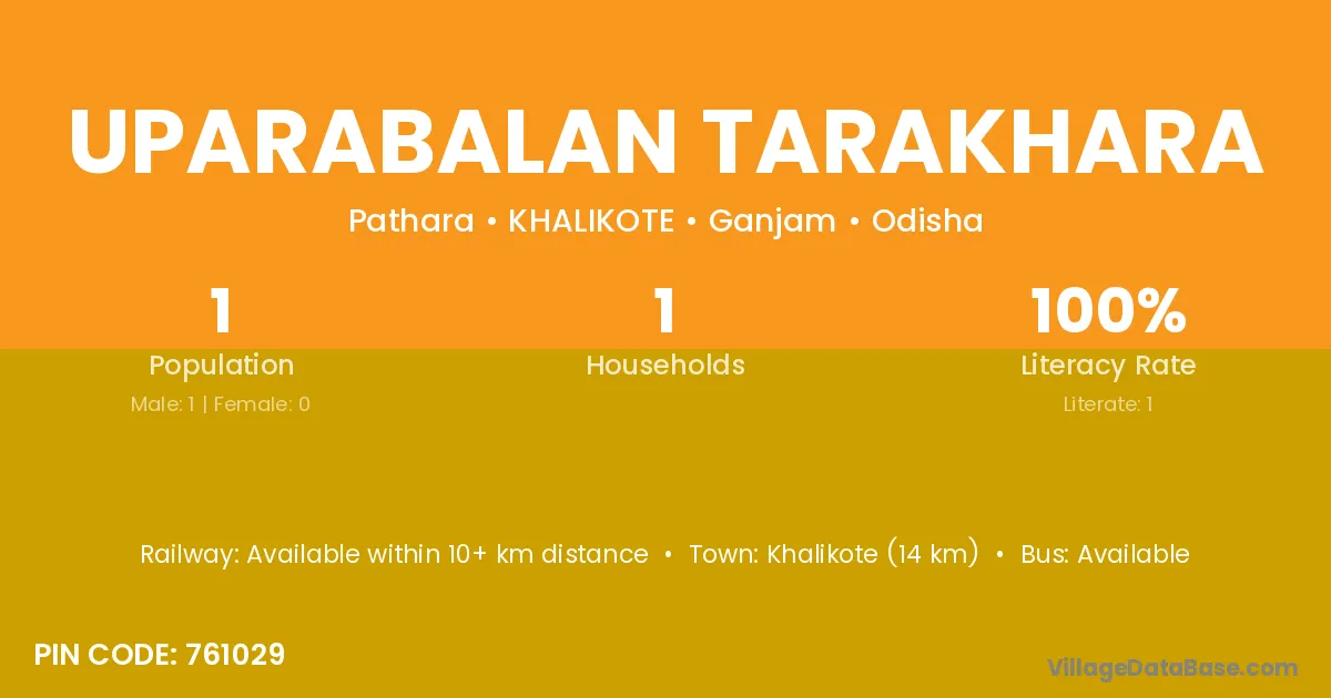 Khalikote (14 km) is the nearest town to Uparabalan Tarakhara village for major economic activities and is located approximately 14 km away.