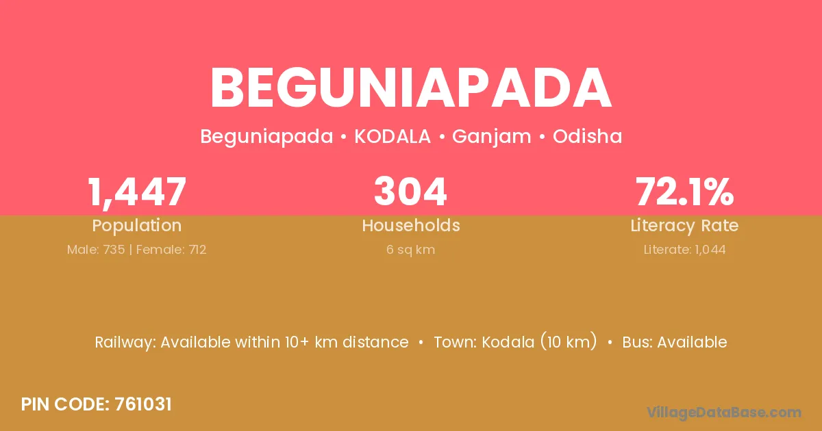 Beguniapada village has a total population of 1,447 people, of which 735 are males and 712 are females.