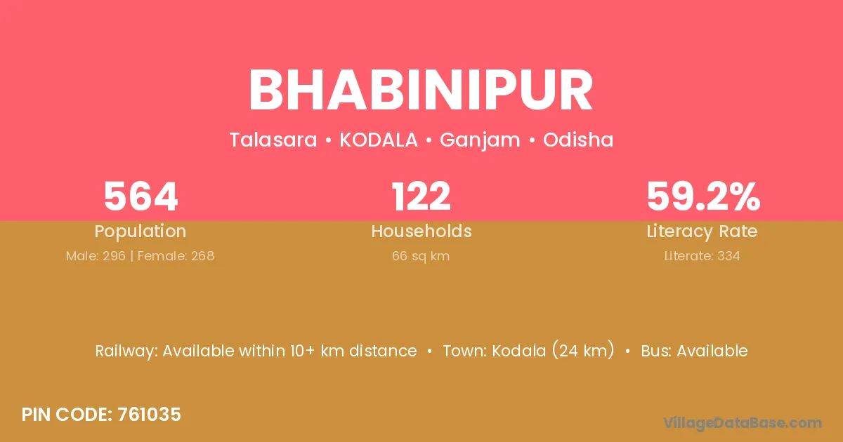Kodala (24 km) is the nearest town to Bhabinipur village for major economic activities and is located approximately 24 km away.