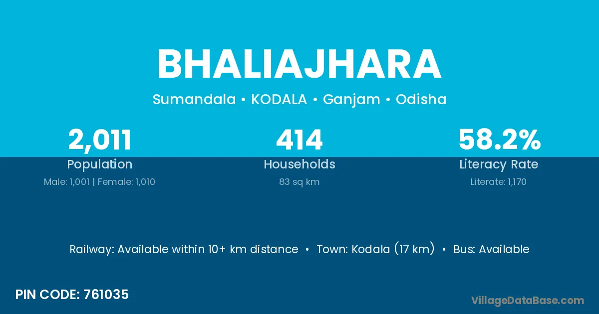 Kodala (17 km) is the nearest town to Bhaliajhara village for major economic activities and is located approximately 17 km away.