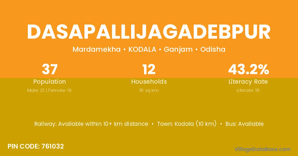 Dasapallijagadebpur village has a total population of 37 people, of which 21 are males and 16 are females.