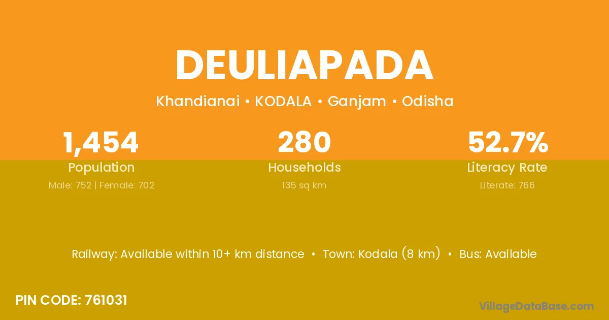 Deuliapada village has a total population of 1,454 people, of which 752 are males and 702 are females.