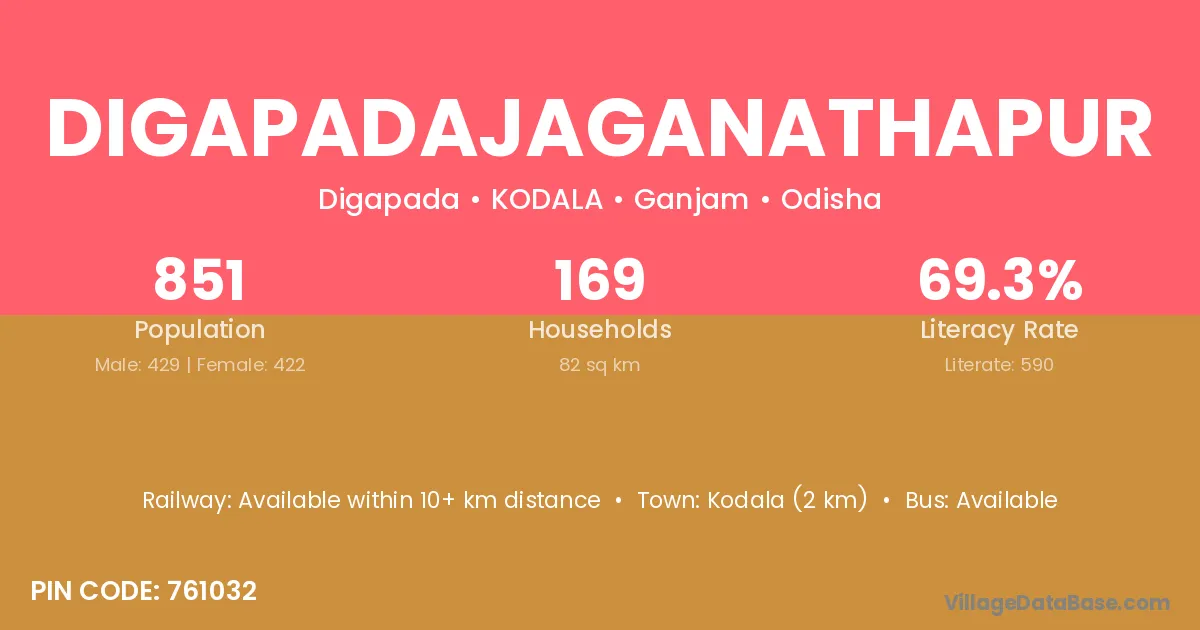 Kodala (2 km) is the nearest town to Digapadajaganathapur village for major economic activities and is located approximately 2 km away.