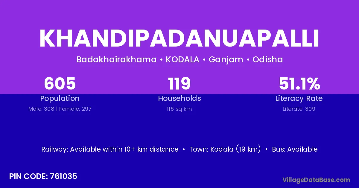 Kodala (19 km) is the nearest town to Khandipadanuapalli village for major economic activities and is located approximately 19 km away.